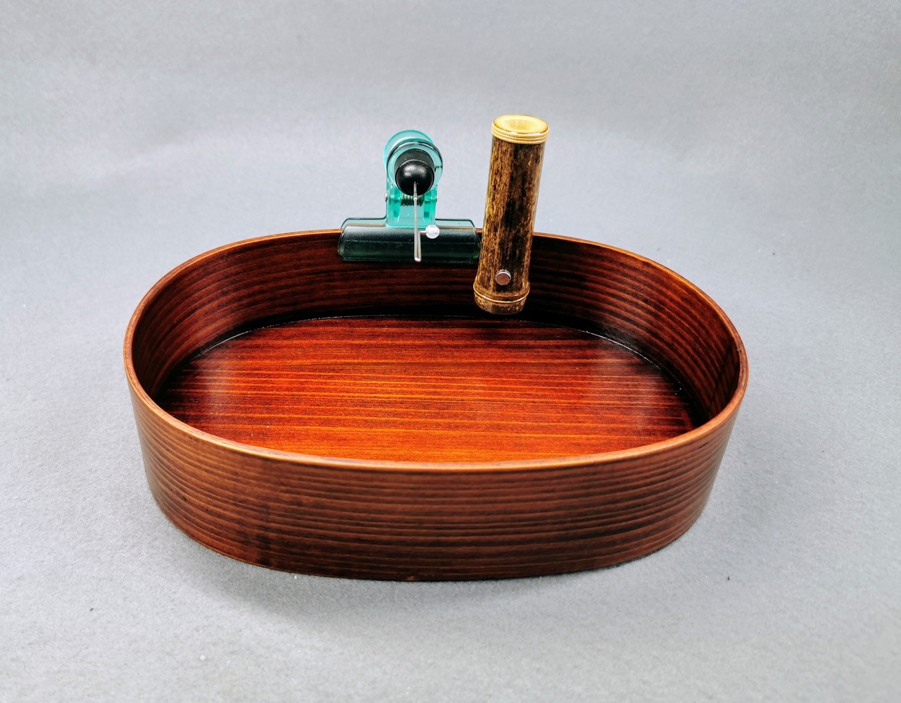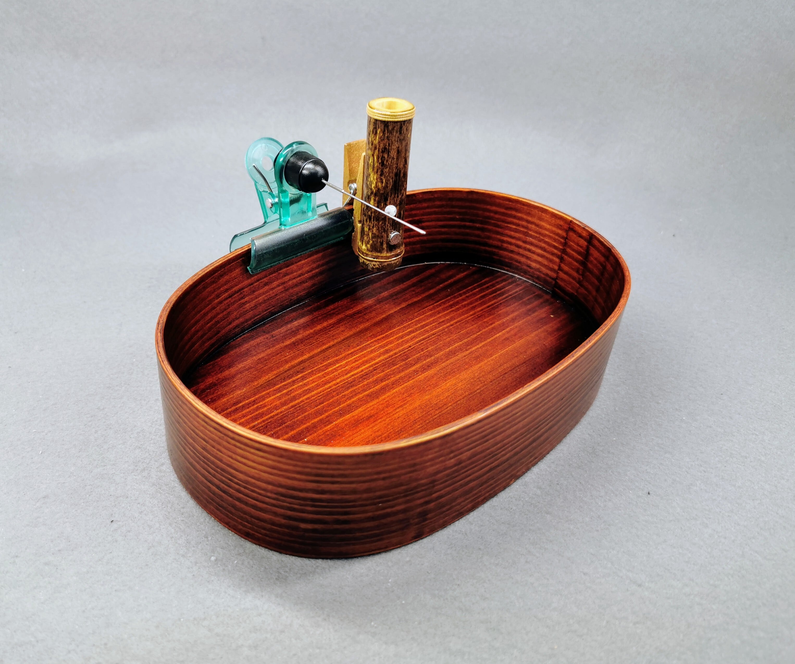 秋田杉に天然漆を施したタナゴ用落とし桶と厳選した紀州黒竹を使用した竿休め、そしてクリップ針外しをセットしたポン太工房オリジナル商品です。