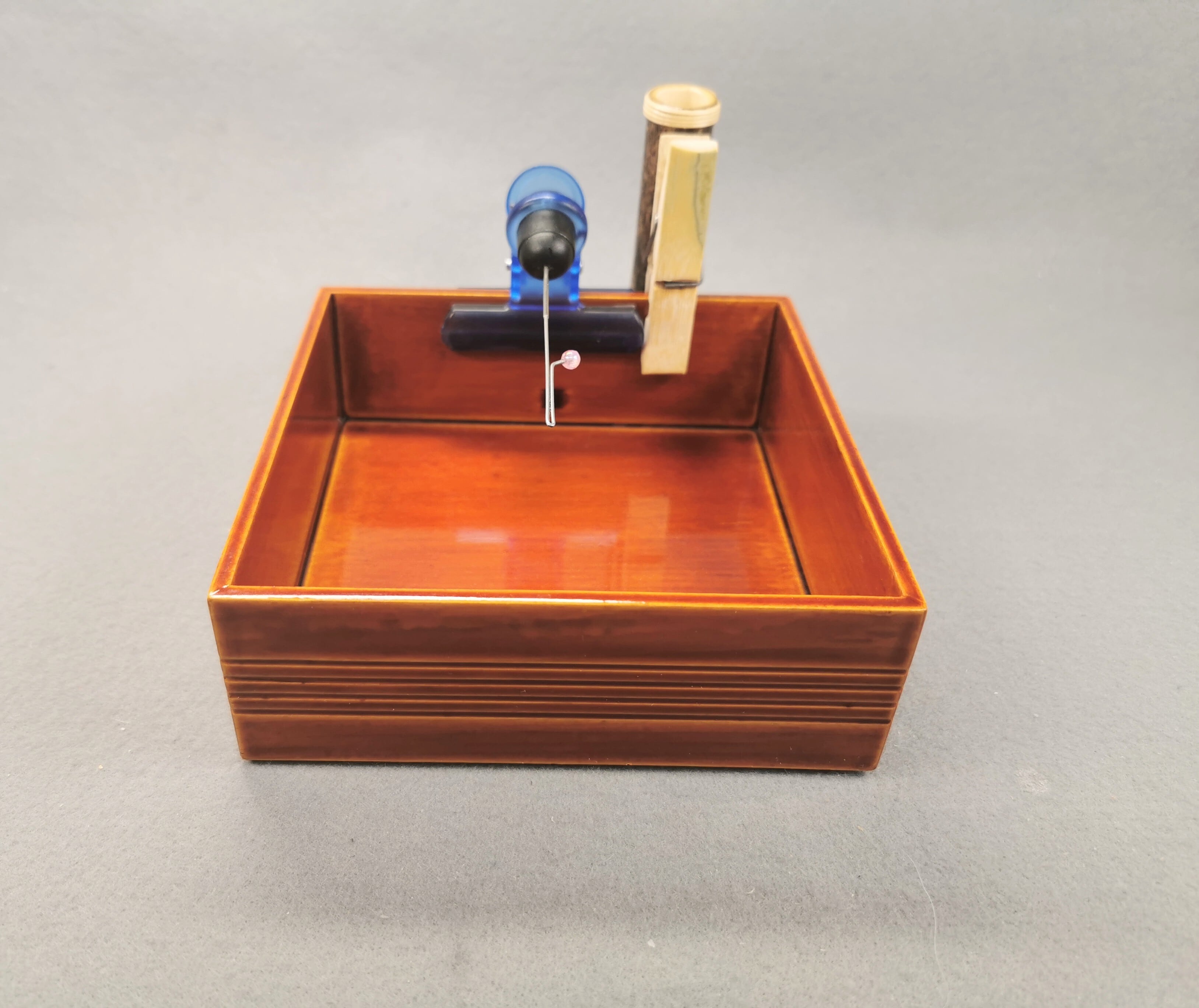 木地師と塗師が伝統技法を駆使し、自然な木目を活かし天然漆を塗り上げた非常に美しい飛騨春慶塗りの重箱を利用した落とし桶でで、付属する商品は紀州産黒竹を使用した竿休め、そしてオリジナルグリップ針外しをセットしたポン太工房オリジナル商品です。